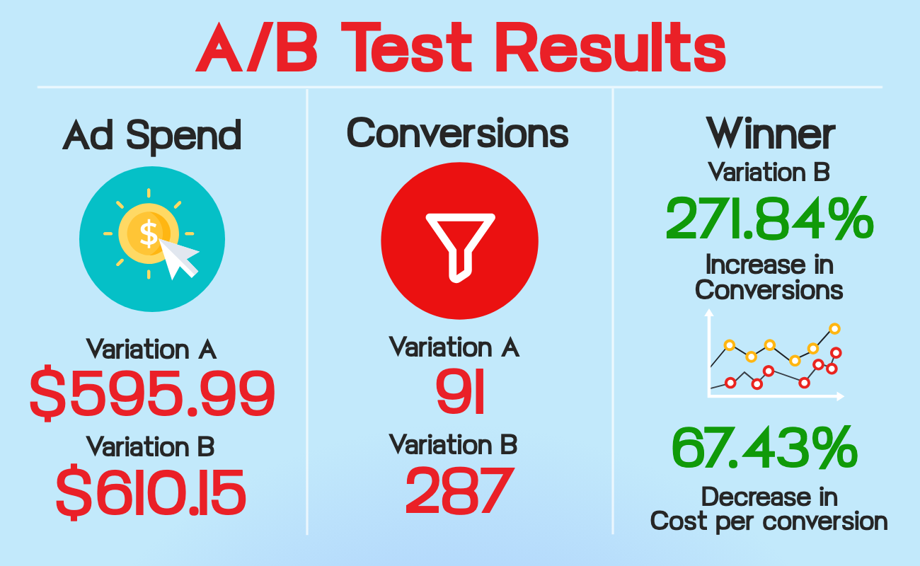 Overall Ad Spend: $1200 (roughly $600 to each variant, give or take a few dollars)